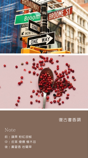 沈穩的木質系列元素中加入一小撮的蘋果酸甜點綴,恰到好處的詮釋出鬆弛與自在,皮革及煙燻更能夠帶出溫暖老木頭的中性氣味,這次加入了一直很想嘗試的岩蘭草,精油特性屬於沈靜安寧、舒緩壓力,也帶有濕漉漉的泥土氣息,整體感受是高貴的木質香。