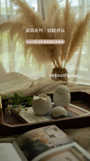 蛋殼系列造型蠟燭,主打「靜心」、「柔和」、「植物香氣」。